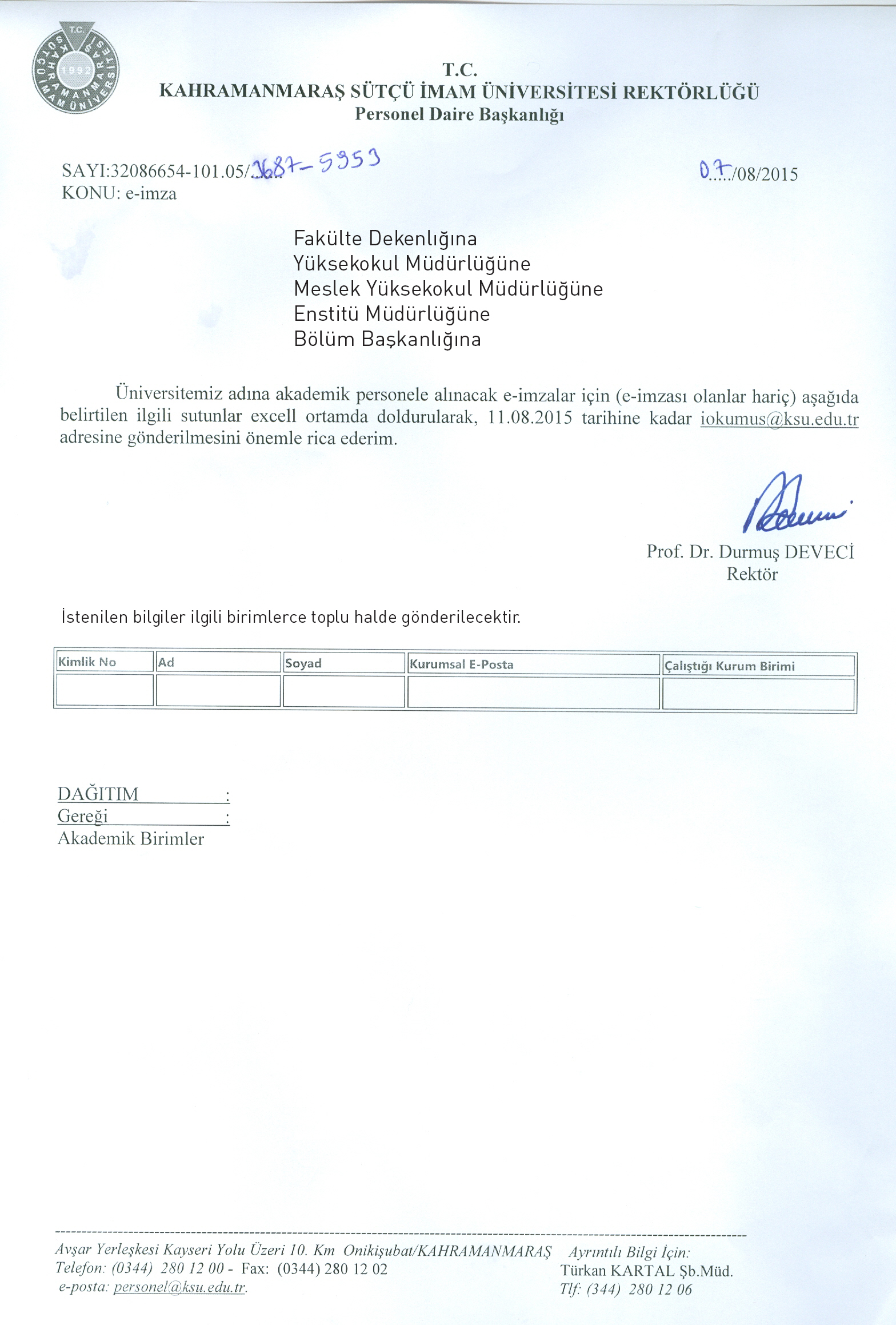 Üniversitemiz adına akademik personele alınacak e-imzalar için (e-imzası olanlar hariç) ekteki formun birimler tarafından doldurularak birimlerin toplu listesinin 11.08.2015 tarihine kadar iokumus@ksu.edu.tr adresine gönderilmesi rica olunur.
