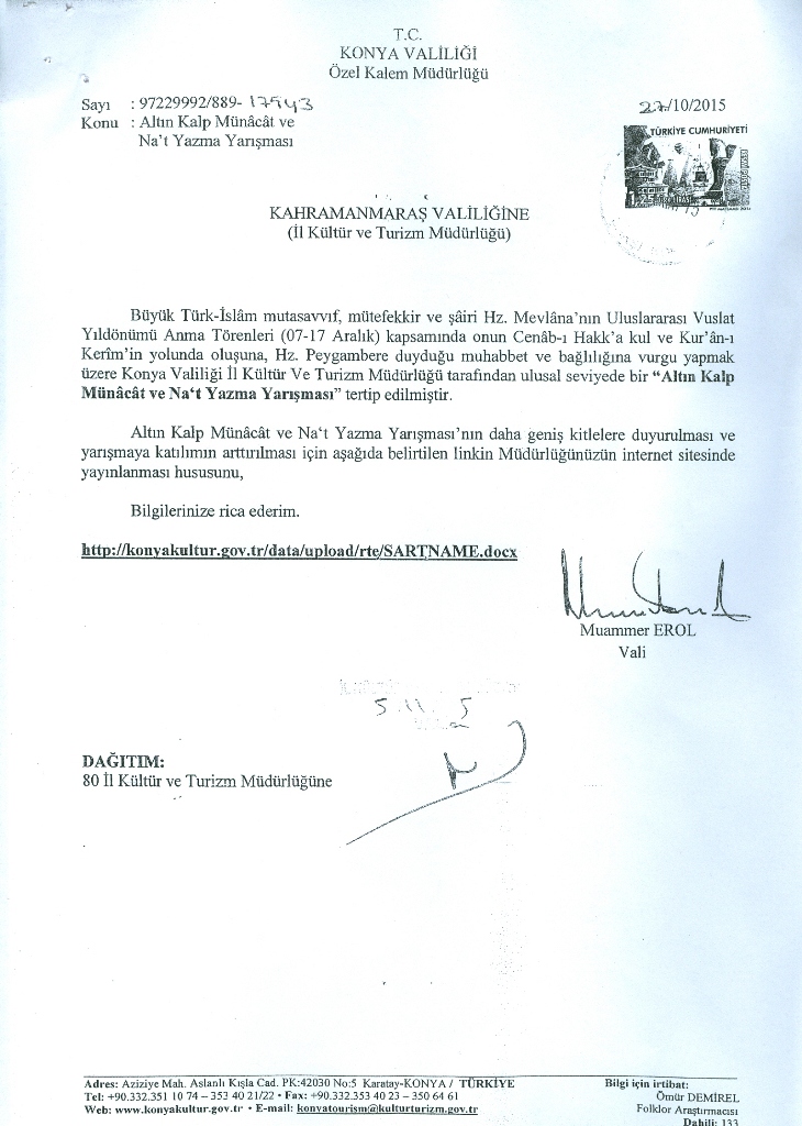 Konya Valiliği Duyurusu: Altın Kalp Münacat ve Na't Yazma Yarışması