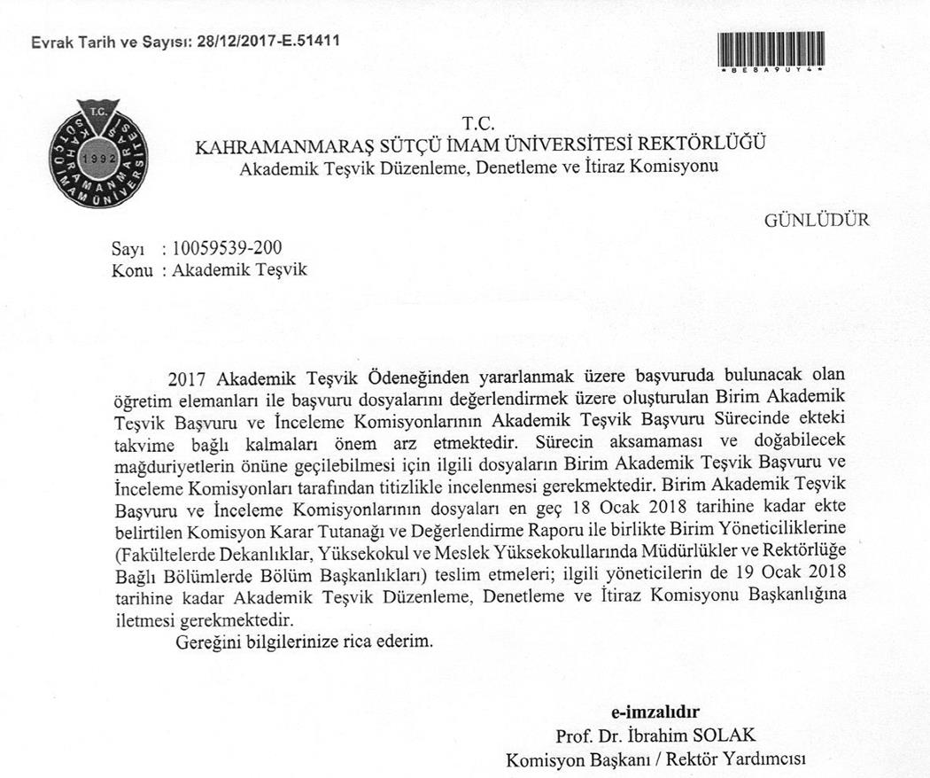 2018 Akademik Teşvik Takvimi