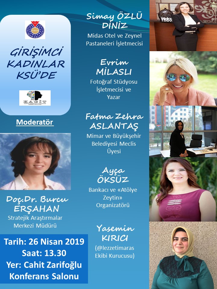 “Merkezimiz ve topluluğumuzun Stratejik Araştırmalar Merkezi ile ortaklaşa düzenlediği Girişimci Kadınlar KSÜ’de etkinliğine Simay Özlü Diniz (Midas Otel ve Zeynel Pastaneleri İşletmecisi), Evrim Milaslı (Fotoğraf Stüdyosu İşletmecisi ve Yazar), Fatma Zehra Aslantaş (Mimar ve Büyükşehir Belediyesi Meclis Üyesi), Ayça Öksüz (Bankacı ve “Atölye Zeytin” Organizatörü) ve Yasemin Kırıcı (@lezzetimaras ekibi kurucusu) konuşmacı olarak katılacaklar. Etkinlikte, Üniversitemiz Stratejik Araştırmalar Merkezi Müdürü Doç.Dr. Burcu Erşahan moderatör olarak yer alacak. Bu etkinlikle, kadın girişimciliğinin artan rolü ve önemi hakkında öğrencilerimiz için farkındalık oluşturmayı amaçlıyoruz. Bütün öğrencilerimizi Girişimci Kadınlar KSÜ’de etkinliğimize bekliyoruz.”