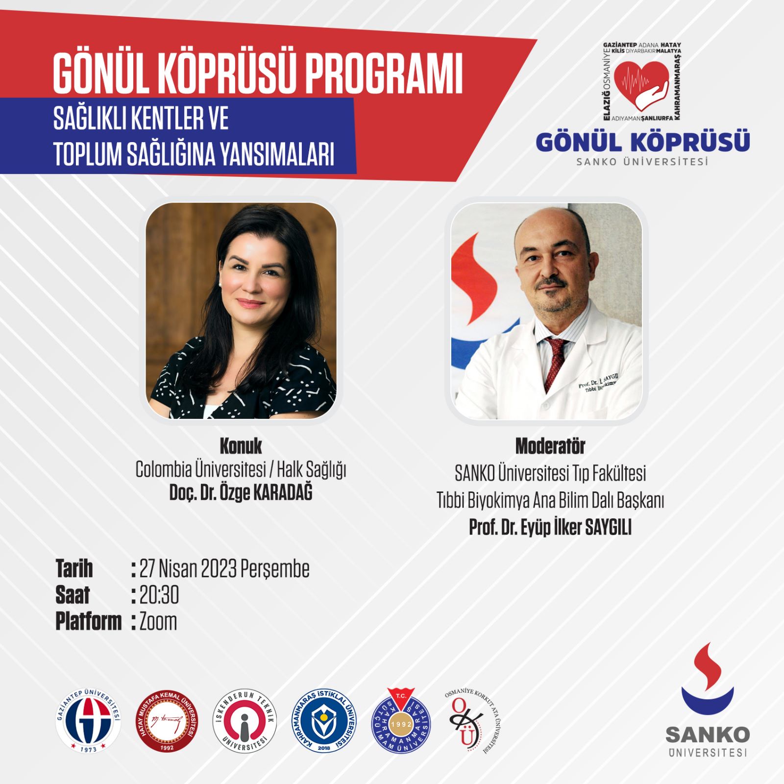 Colombia Üniversitesi - Halk Sağlığı / Doç. Dr. Özge KARADAĞ’ın konuk olarak katılacağı, ‘Sağlıklı Kentler ve Toplum Sağlığına Yansımaları’ konulu Gönül Köprüsü Programımız, SANKO Üniversitesi Tıp Fakültesi Tıbbı Biyokimya Ana Bilim Dalı Başkanı Prof. Dr. Eyüp İlker SAYGILI’nın moderatörlüğünde, 27 Nisan 2023 Perşembe günü saat 20:30’da 'Zoom' üzerinden gerçekleşecektir.