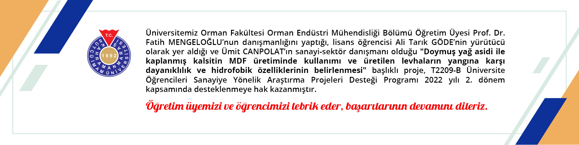 Doymuş yağ asidi ile kaplanmış kalsitin MDF üretiminde kullanımı ve üretilen levhaların yangına karşı dayanıklılık ve hidrofobik özelliklerinin belirlenmesi projesine TÜBİTAK'tan destek