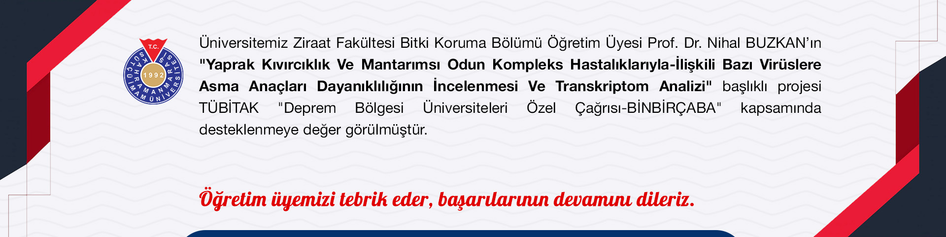 Yaprak Kıvırcıklık Ve Mantarımsı Odun Kompleks Hastalıklarıyla-İlişkili Bazı Virüslere Asma Anaçları Dayanıklılığının İncelenmesi Ve Transkriptom Analizi Başlıklı Proje TÜBİTAK Deprem Bölgesi Üniversiteleri Özel Çağrısı-BİNBİRÇABA Kapsamında Desteklenmeye Değer Görülmüştür