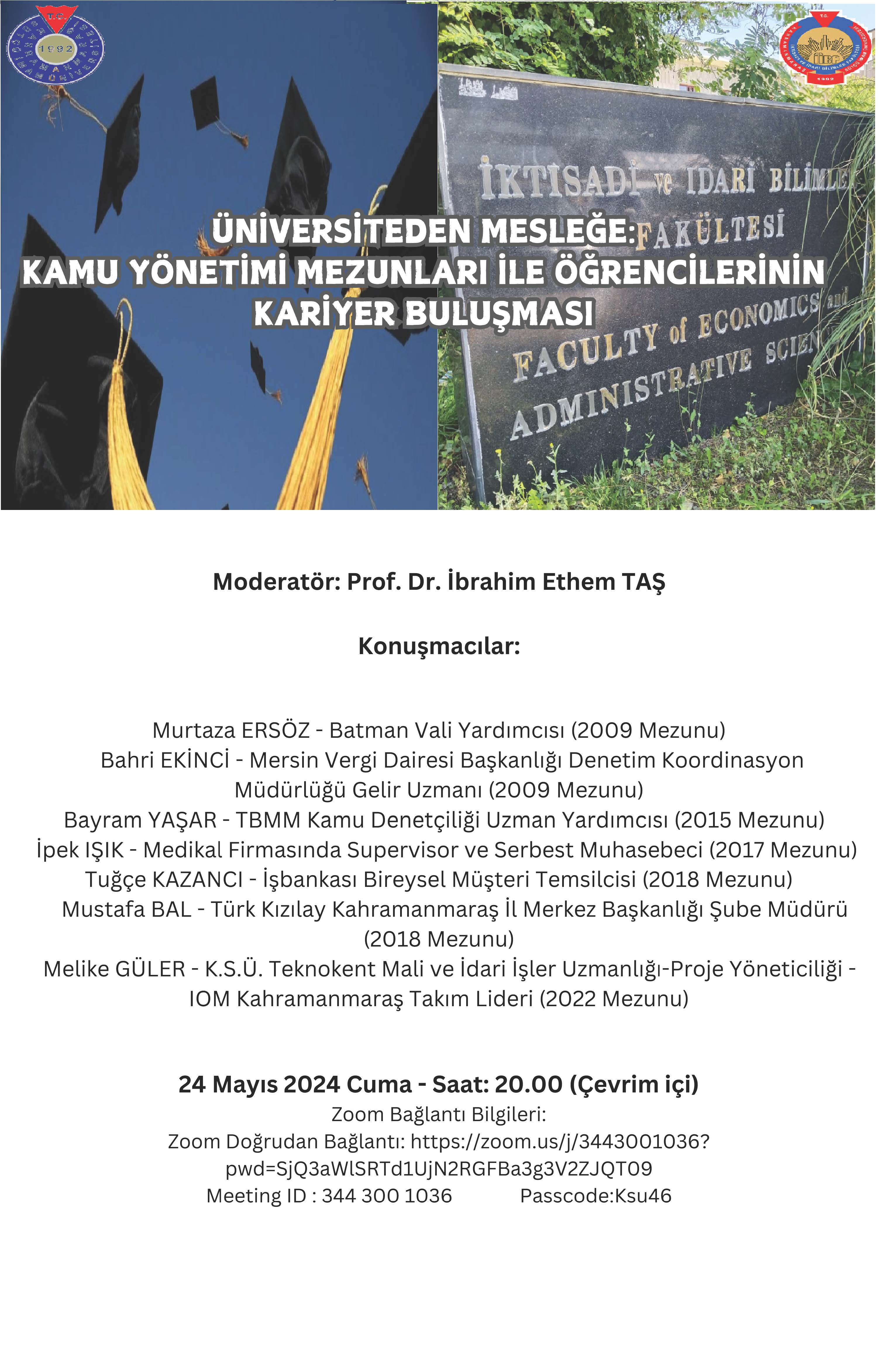 KSÜ İİBF Kamu Yönetimi Bölümü ile Mezunlarının Kariyer Buluşması: Üniversiteden Mesleğe” etkinliği 24 Mayıs 2024 Cuma günü saat 20.00'da ZOOM üzerinden çevrim içi olarak gerçekleştirilecek olup tüm öğrencilerimiz ve konuya ilgi duyan katılımcılar davetlidir.